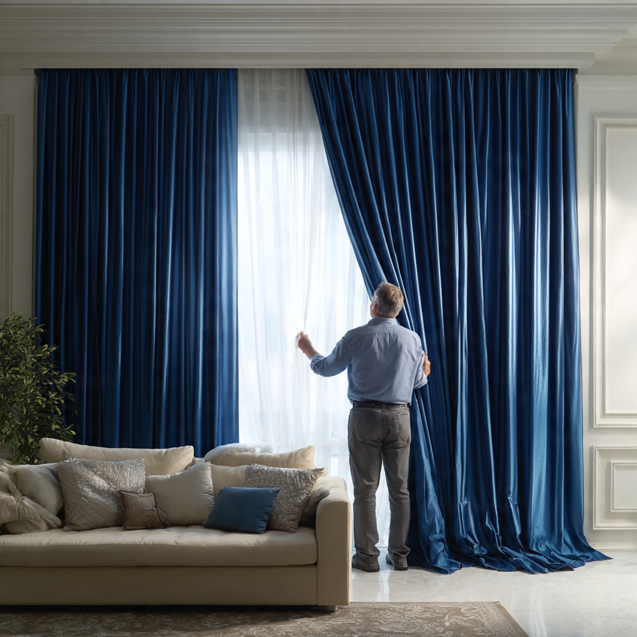 Adding long, flowing silk curtain panels in a rich blue, such as royal or sapphire, is a simple yet effective way to introduce sheer elegance and height to a living room. The natural sheen of silk adds a subtle, flowing texture that contrasts nicely with matte walls and cotton upholstery.