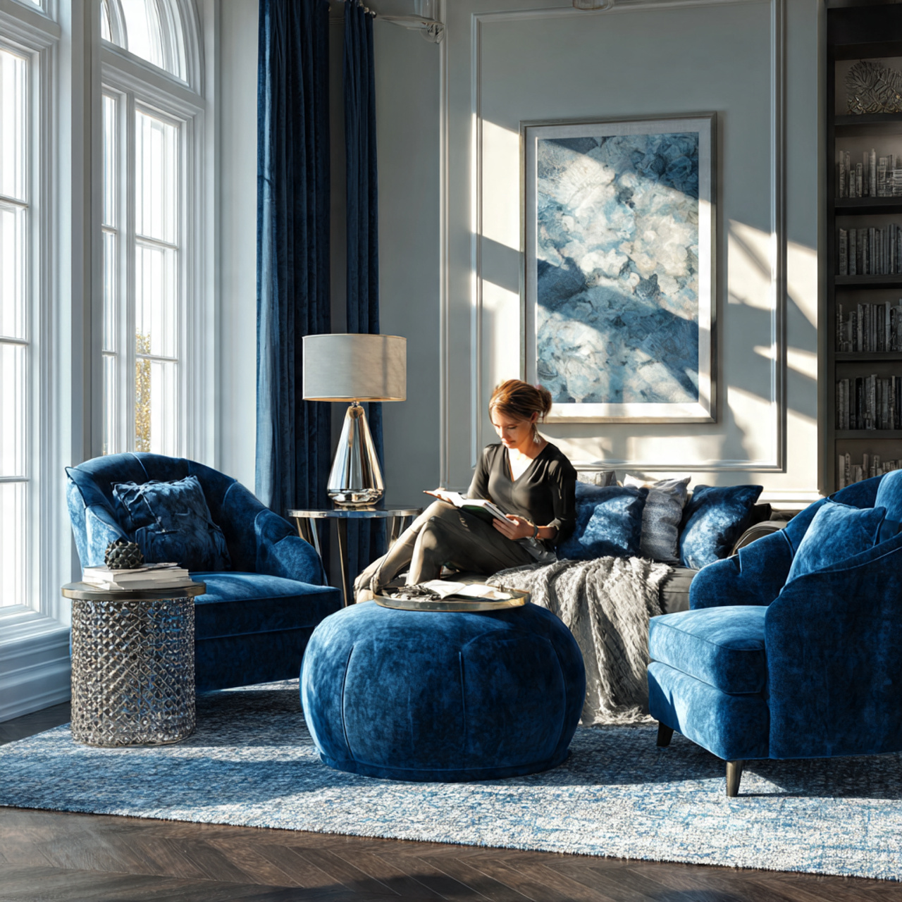 Sapphire blue velvet is synonymous with luxury and depth, making it an excellent choice for statement furniture like a pair of high-backed armchairs or an oversized ottoman. The way velvet catches the light emphasizes the vibrancy of the sapphire hue, immediately elevating the entire room’s feel.