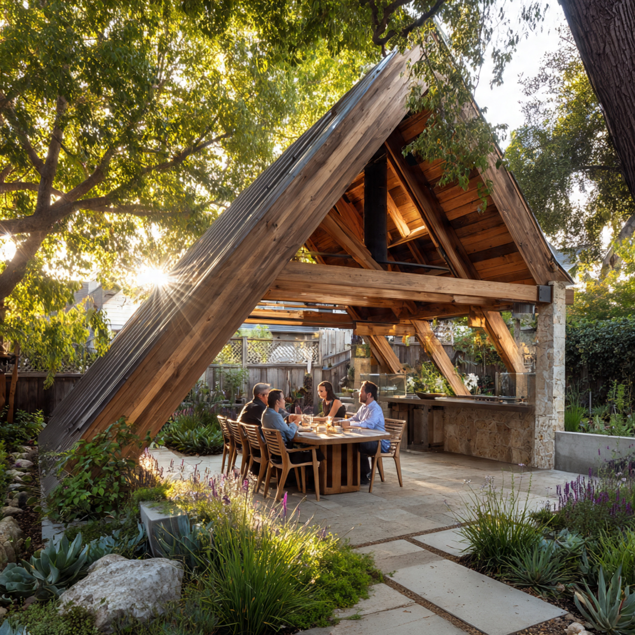 This design is particularly effective at shedding snow and rain, making it a practical choice for regions with heavy precipitation. The soaring height of the A-frame makes the patio feel incredibly open and airy, providing a grand stage for large-scale outdoor entertaining and dining.