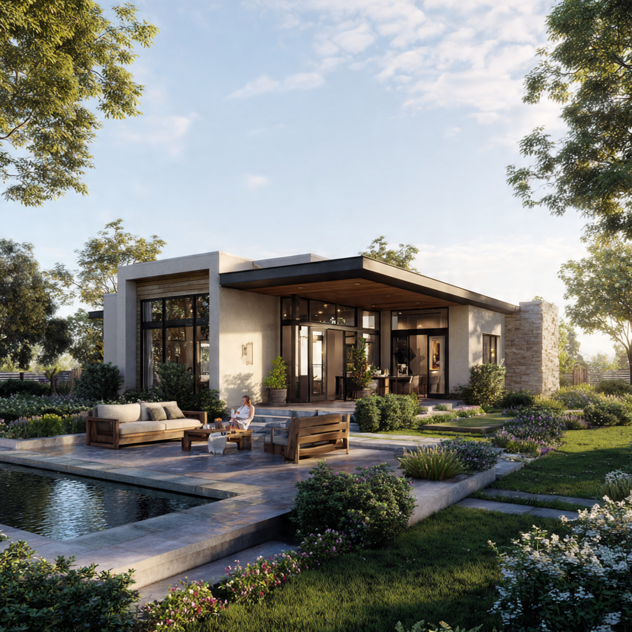 This approach prevents the area closest to the house from becoming too dark and gloomy. It creates a dynamic lighting environment where you can watch the clouds pass by or look at the stars at night while remaining completely protected from wind and rain.