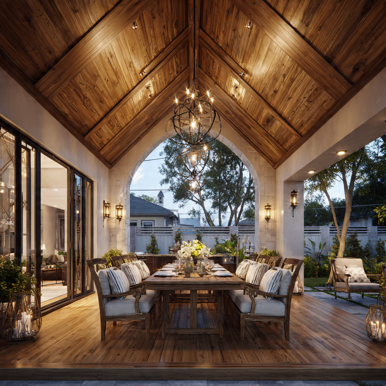 The high ceiling provides extra space for hanging decorative elements like oversized chandeliers or large outdoor ceiling fans. Using tongue-and-groove wood on the underside of the vault can create a warm, cabin-like feel that makes the outdoor room feel incredibly high-end and luxurious.