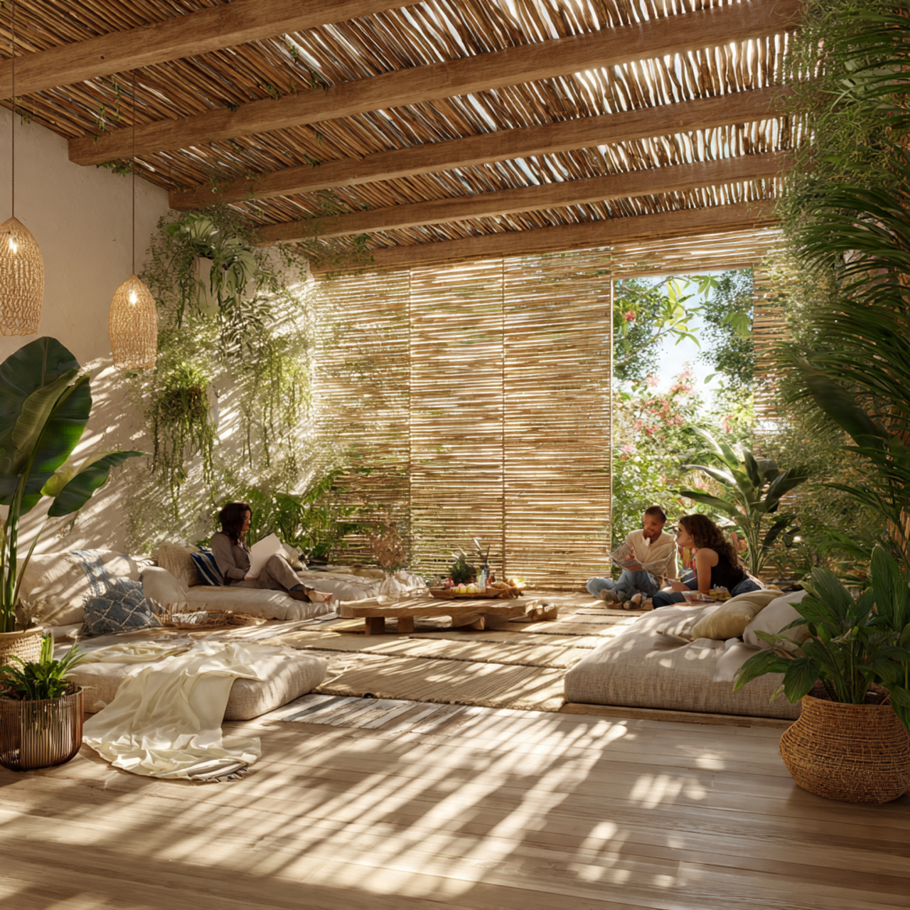 The bohemian inspired bamboo screen cover is a fantastic way to introduce a relaxed, global aesthetic to your outdoor living area. Bamboo provides a lightweight and sustainable roofing option that filters sunlight into soft, dappled patterns across the floor, creating a tranquil and cozy atmosphere.