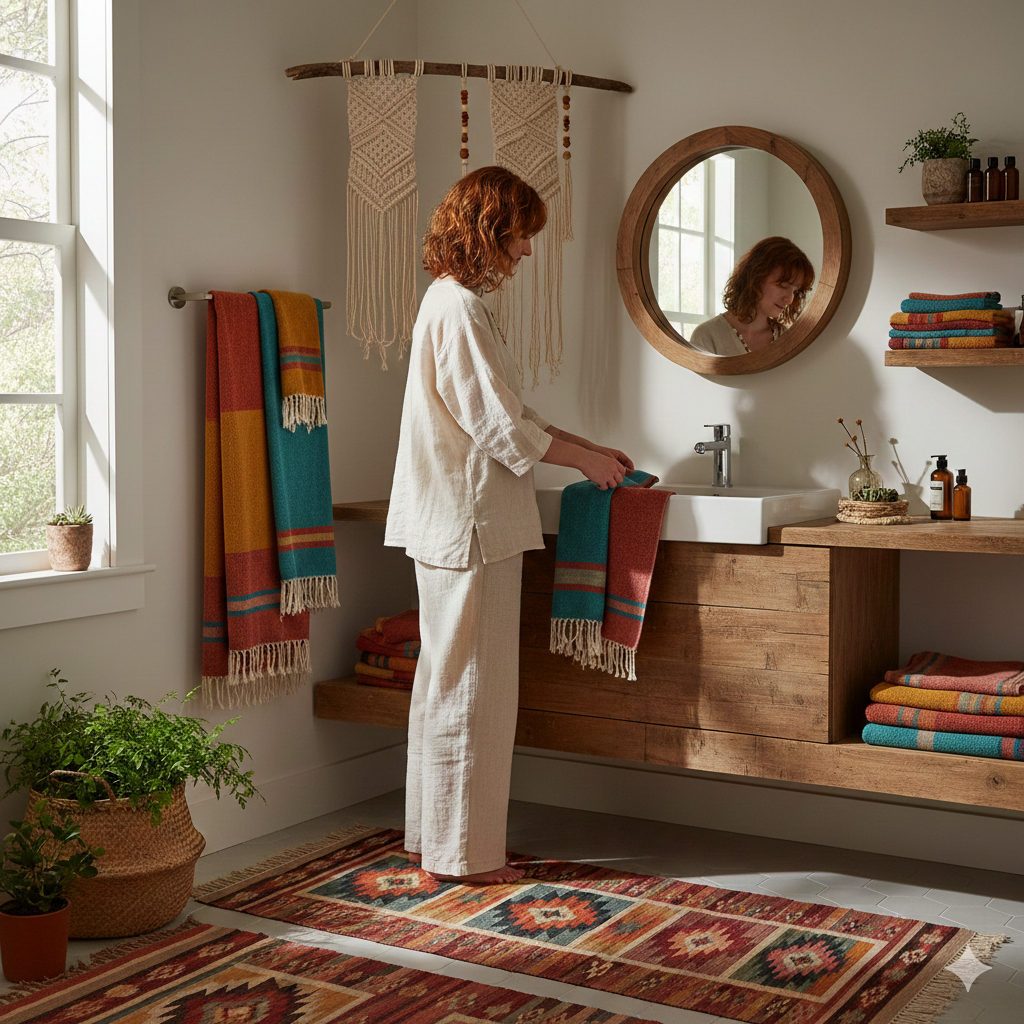 Layering the space with fringed towels, colorful kilim rugs, and macramé hangings introduces a sense of worldly adventure. These textiles bring a softness and a variety of patterns that make the room feel curated over time.