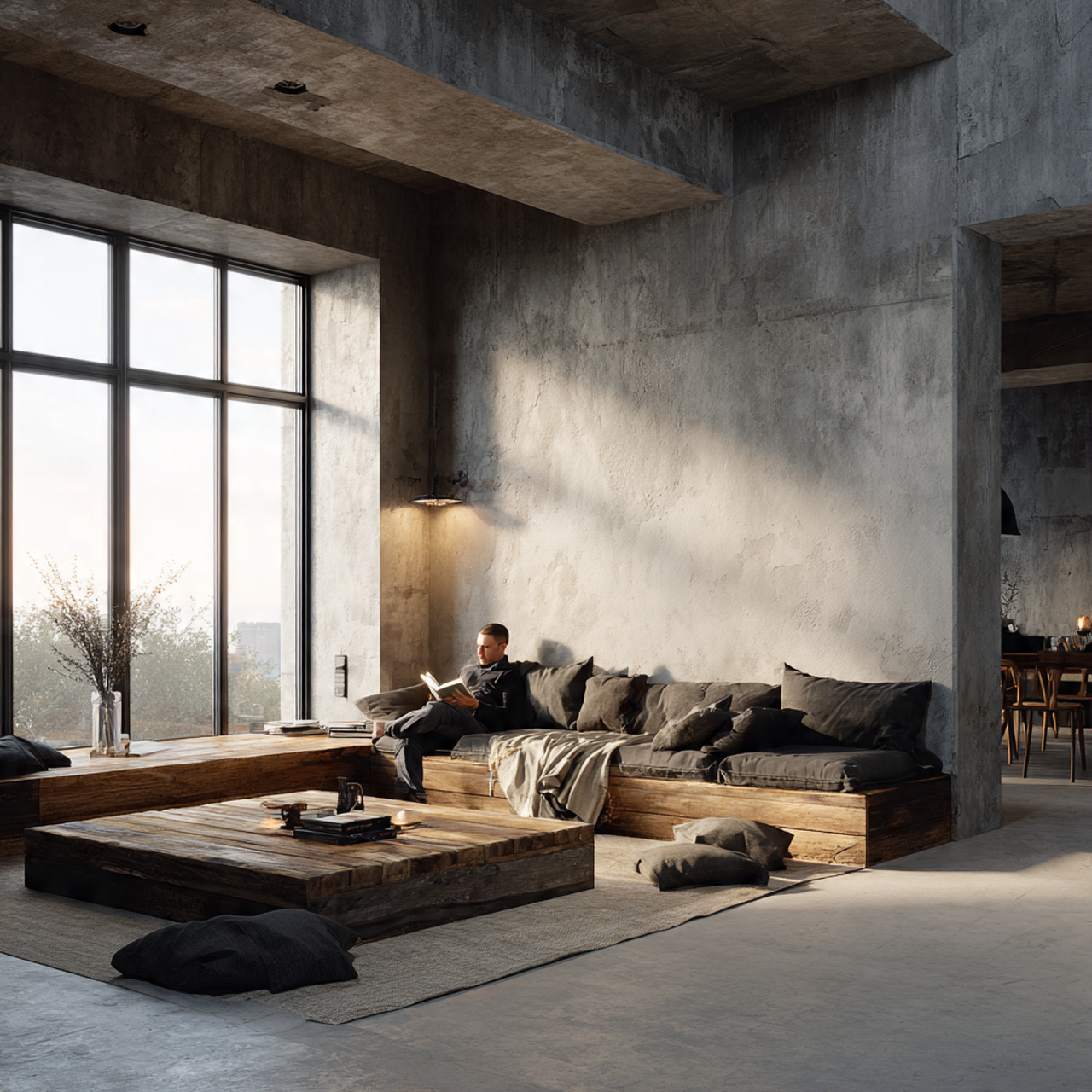 Exposed concrete surfaces offer a brutalist yet poetic honesty, showing the raw ingredients of the home’s construction. The mottled gray tones and industrial texture provide a neutral backdrop that makes natural wood and soft textiles pop with life.