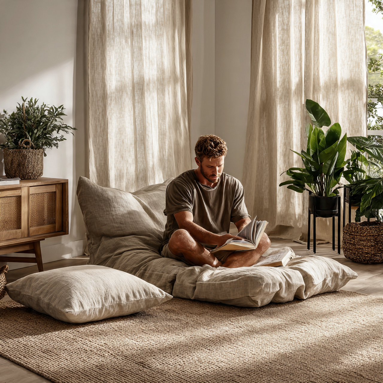 Organic cotton floor cushions encourage a shift toward lower-level living, which fosters a more intimate and grounded social environment. Choosing cushions in raw, unbleached cotton maintains a neutral palette while providing soft, movable seating for guests.