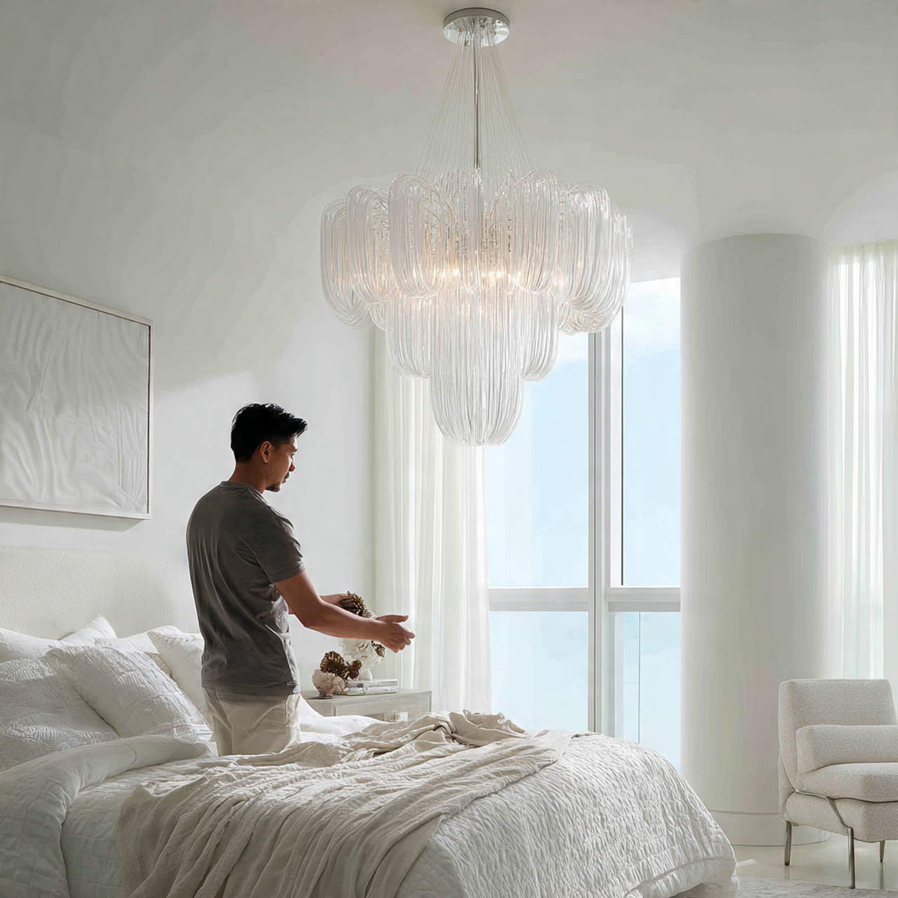 The fixture itself becomes a piece of sculpture during the day and a source of beautiful, diffused light at night. It is an effective way to introduce a sense of grandeur and high-end style to even the most minimalist bedroom layouts.